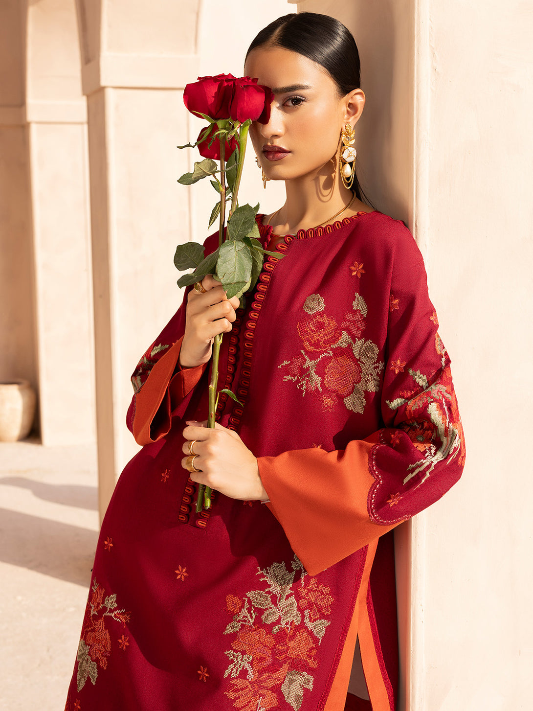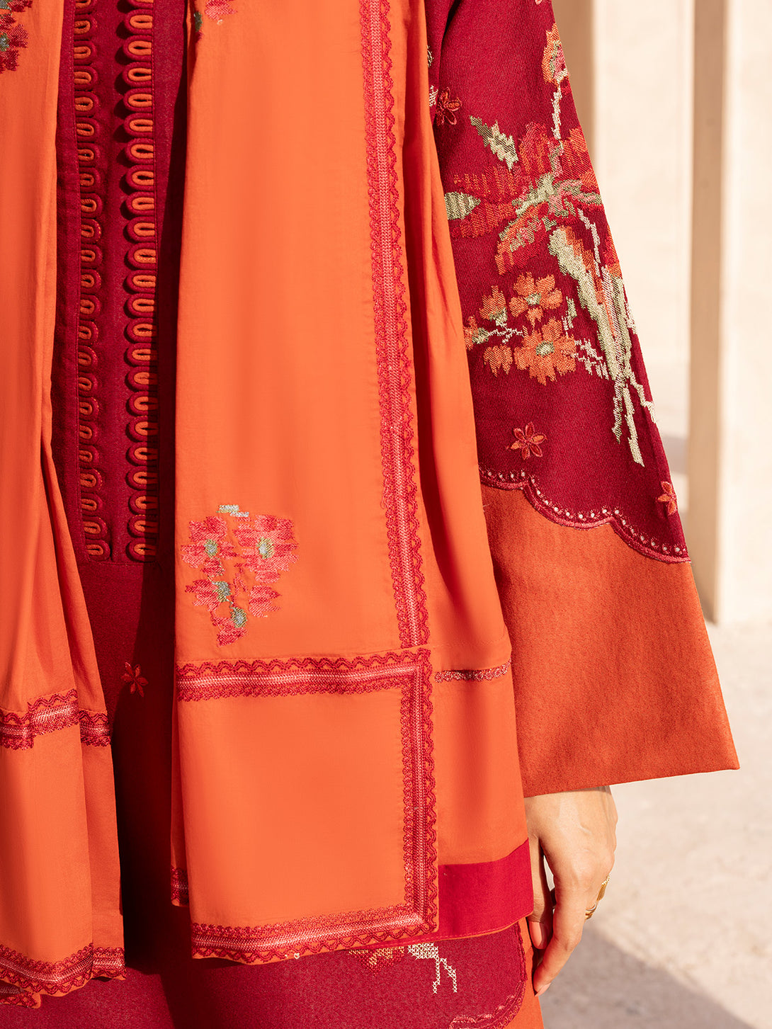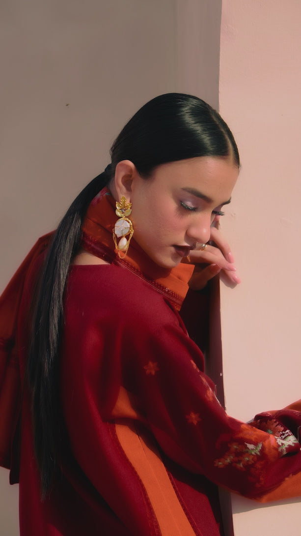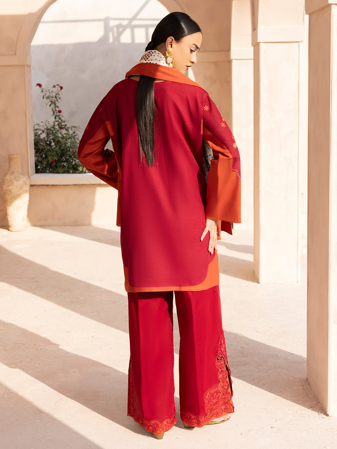 Red karandi suit with multi-head cross-stitch, enhanced stitching, draped shoulder sleeves & laser-cut embroidered trousers - Elegance that speaks.