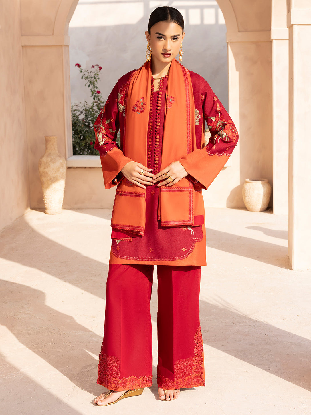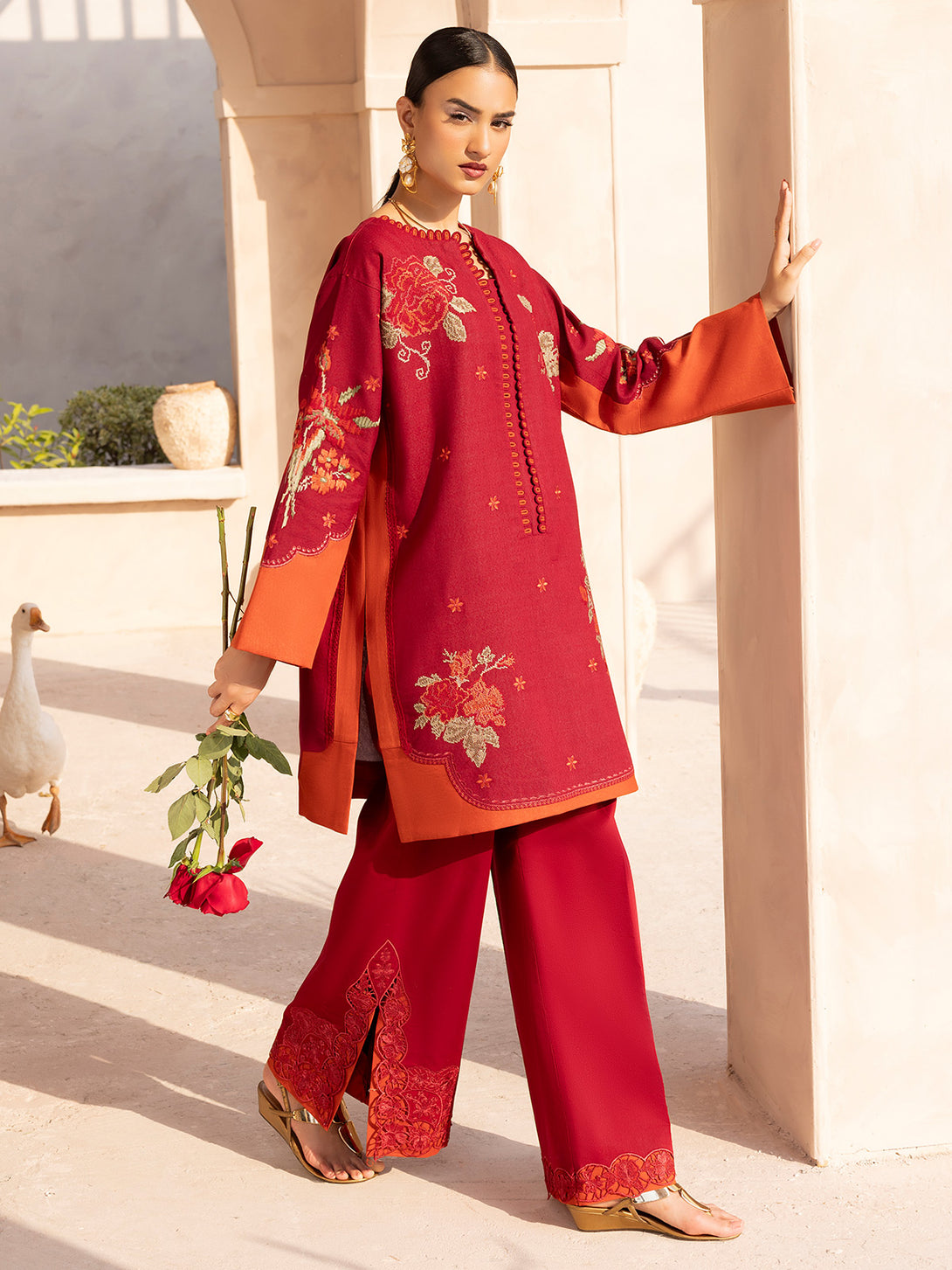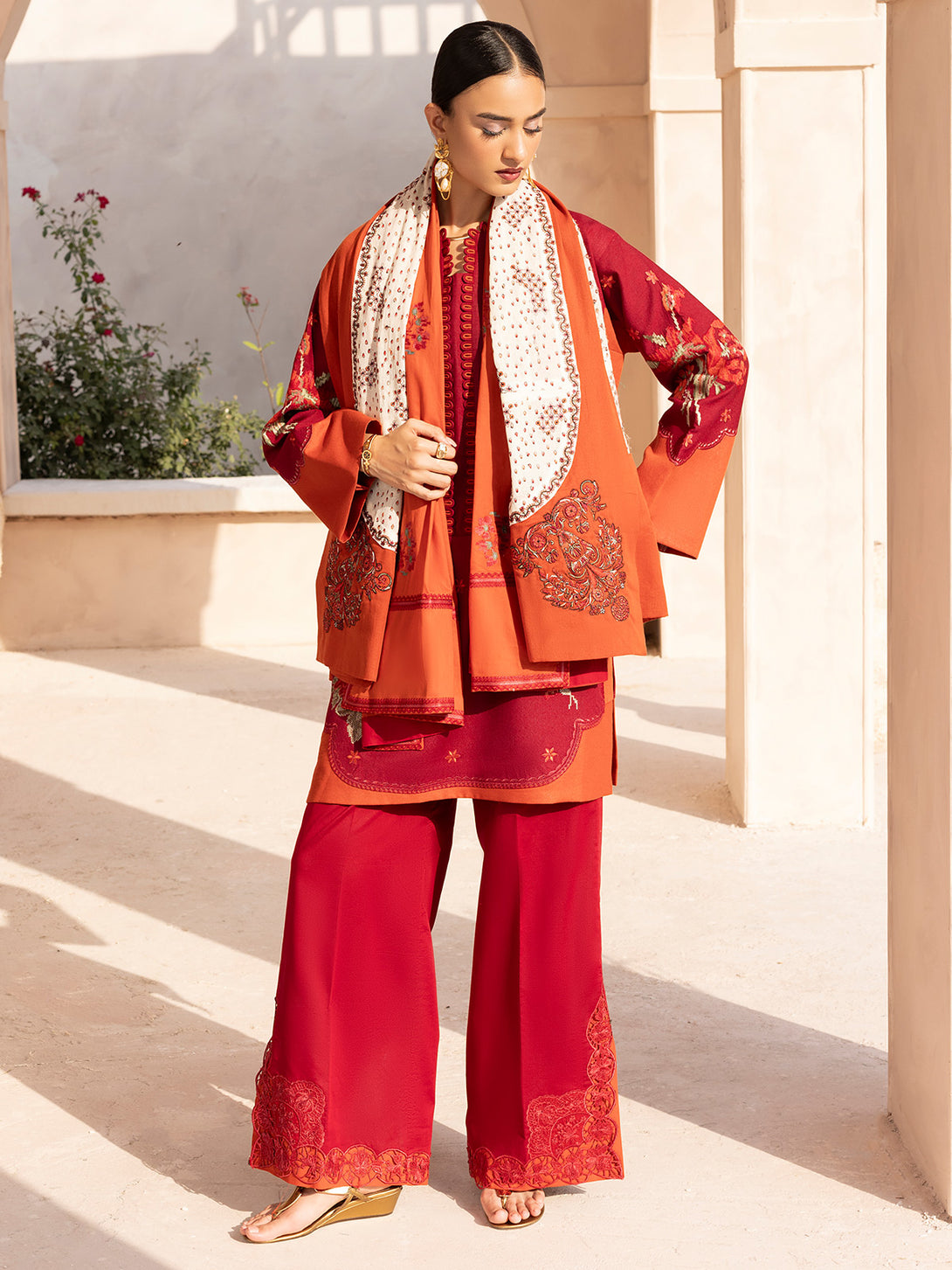 Red karandi suit with multi-head cross-stitch, enhanced stitching, draped shoulder sleeves & laser-cut embroidered trousers - Elegance that speaks.