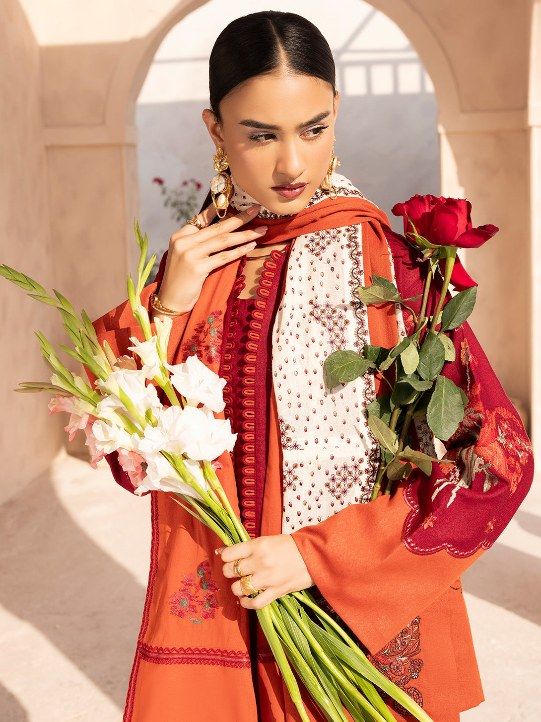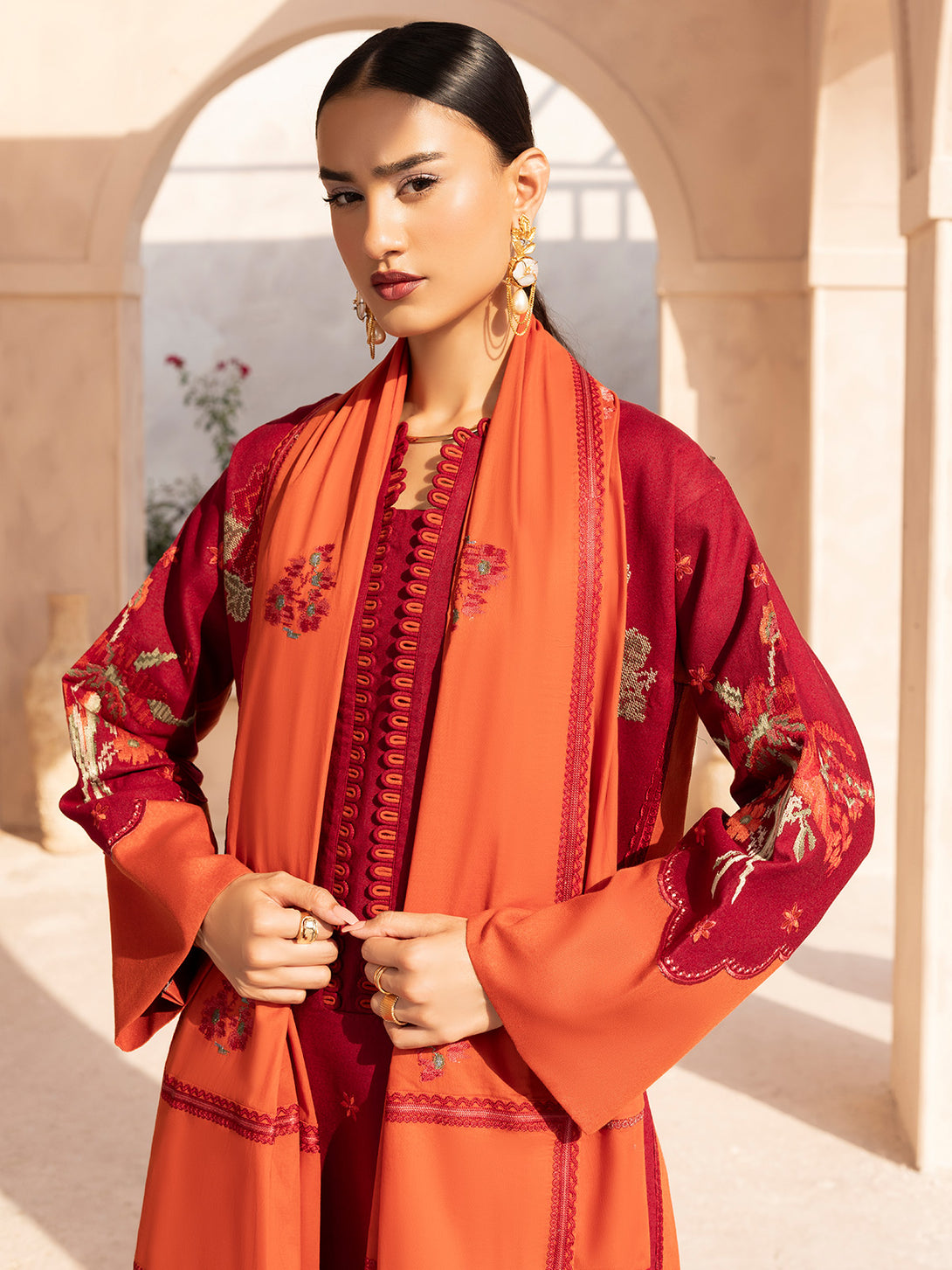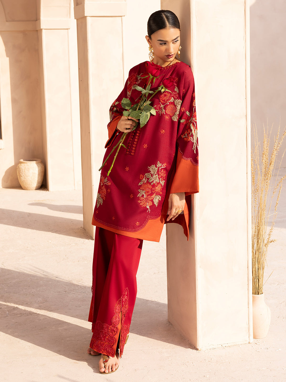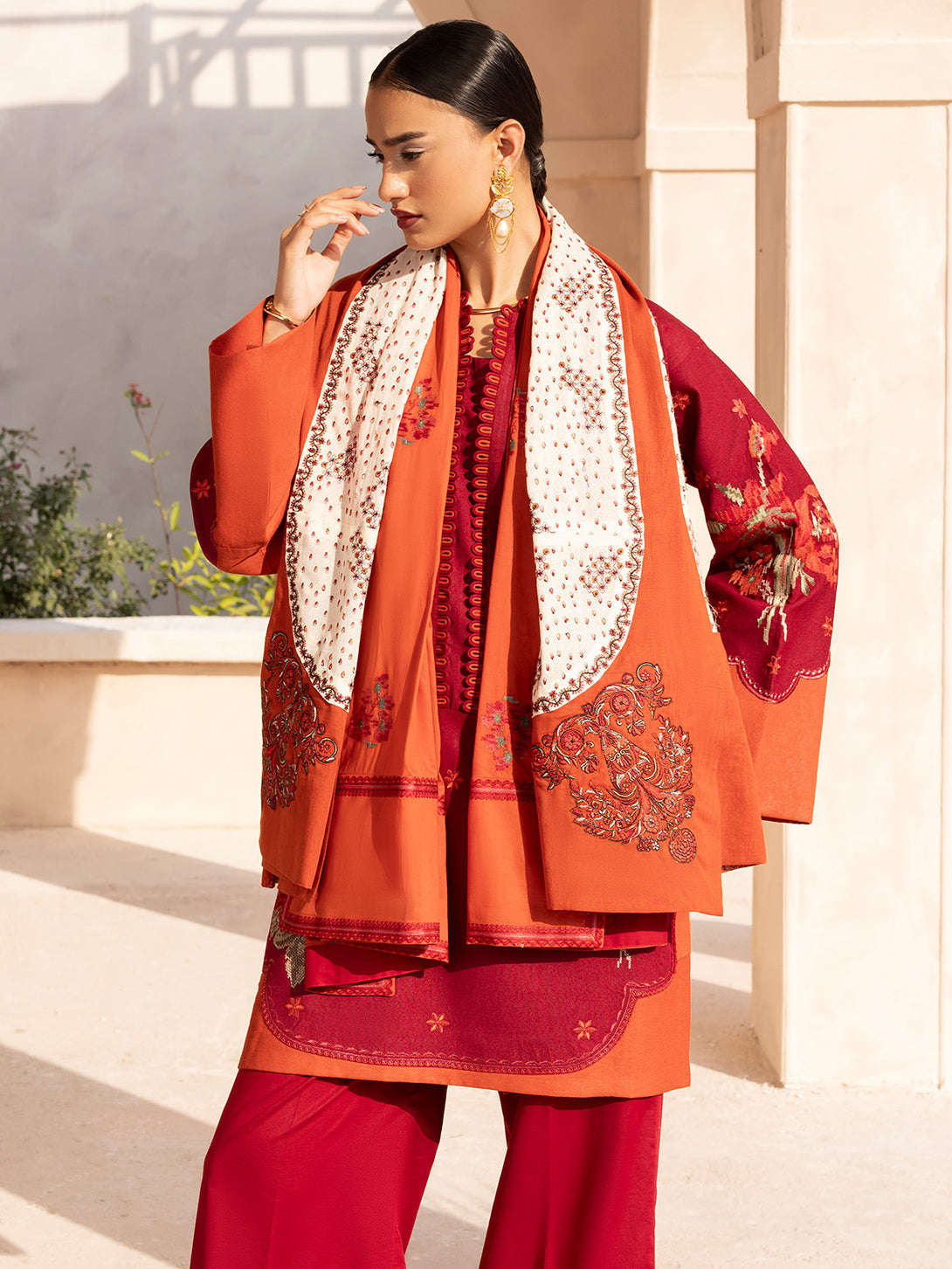 Red karandi suit with multi-head cross-stitch, enhanced stitching, draped shoulder sleeves & laser-cut embroidered trousers - Elegance that speaks.