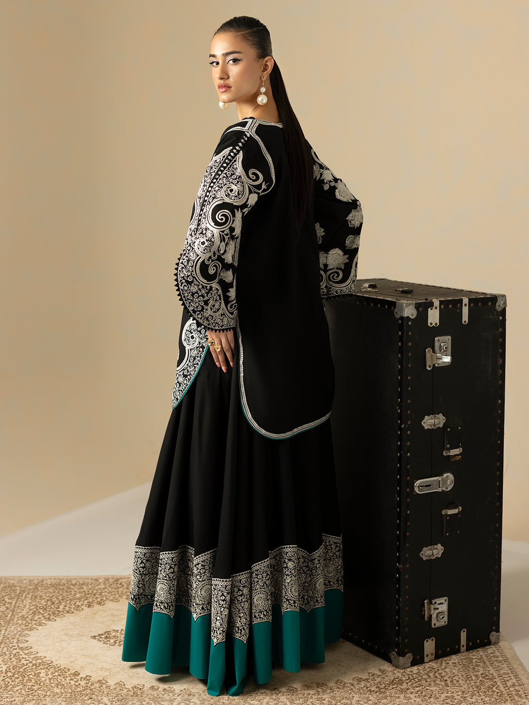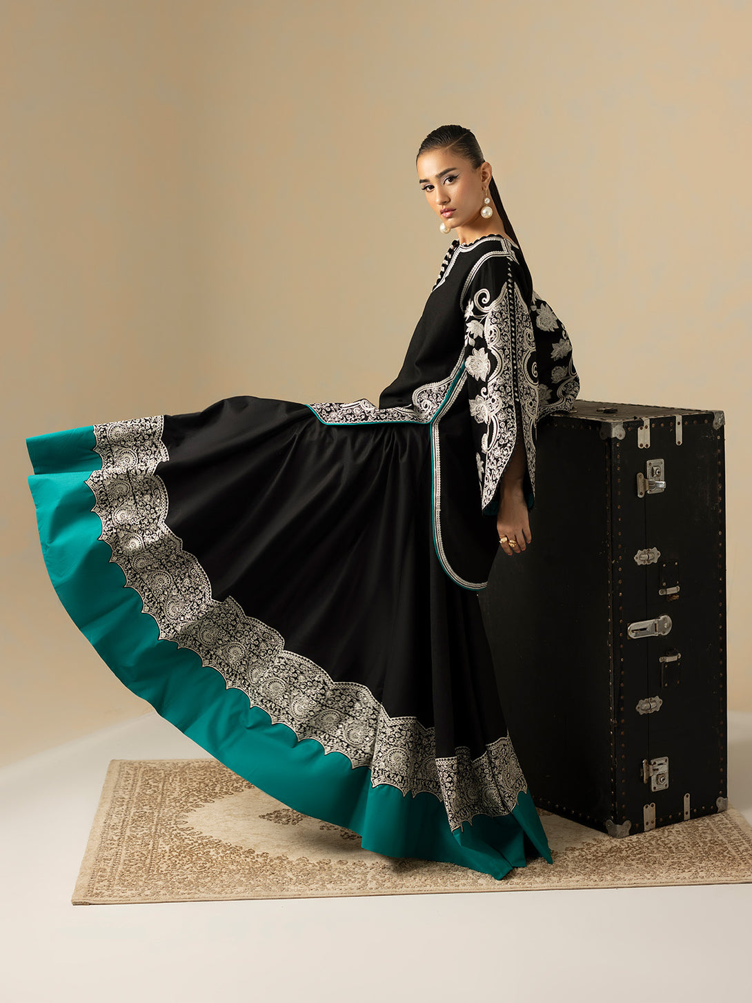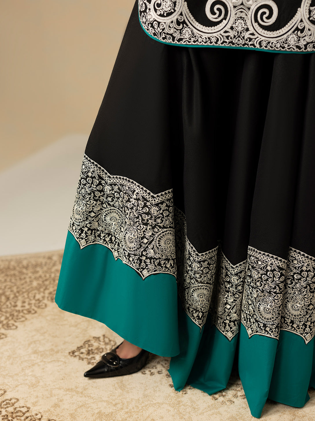 This beautiful black karandi skirt features intricate multi-head embroidery across its circular silhouette, blending craftsmanship with graceful movement. A timeless statement for every occasion.