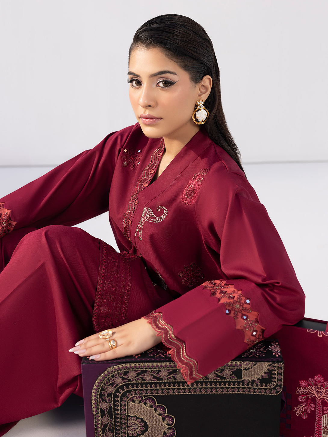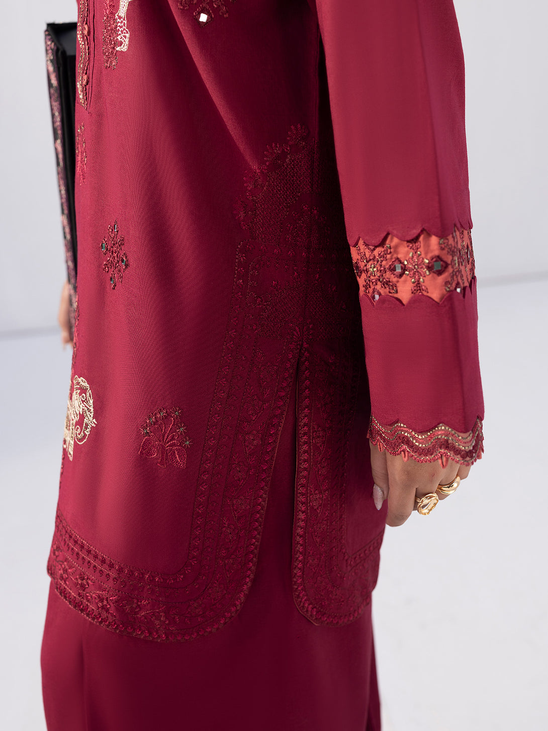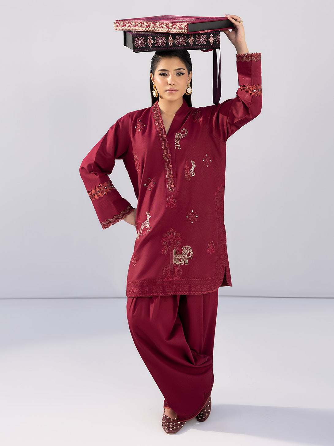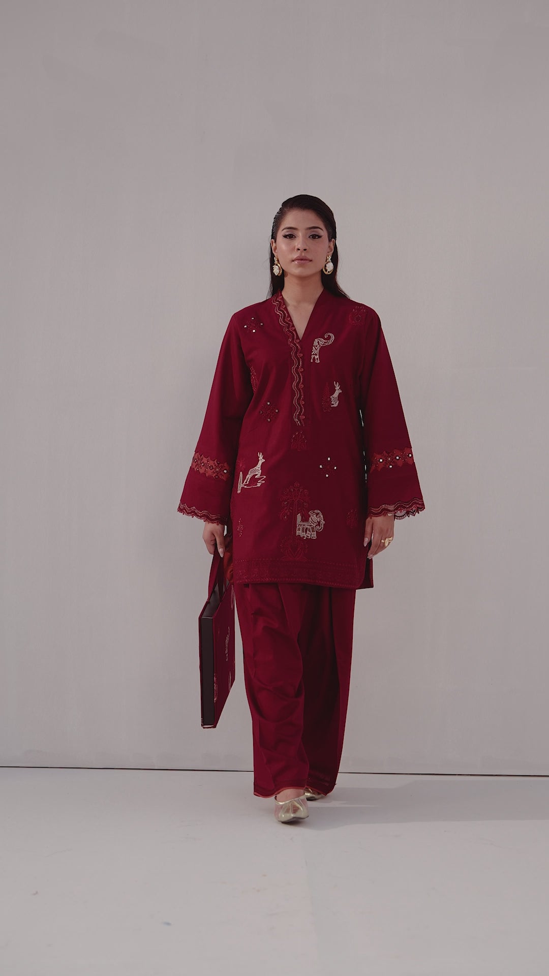 A striking red karandi ensemble with exquisite embroidery and shesha work, paired with a graceful farshi shalwar. Pure elegance, pure confidence.