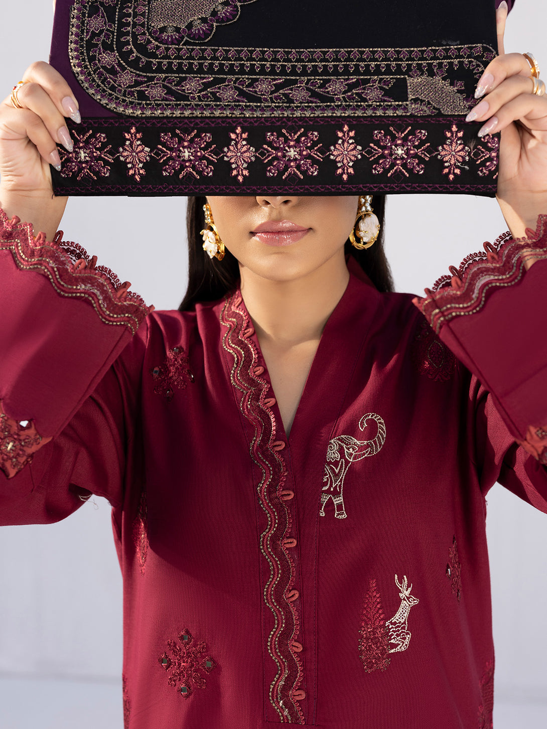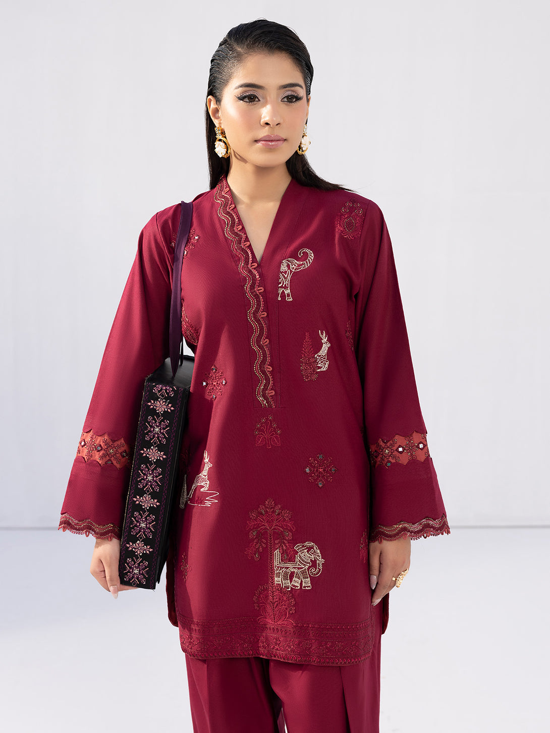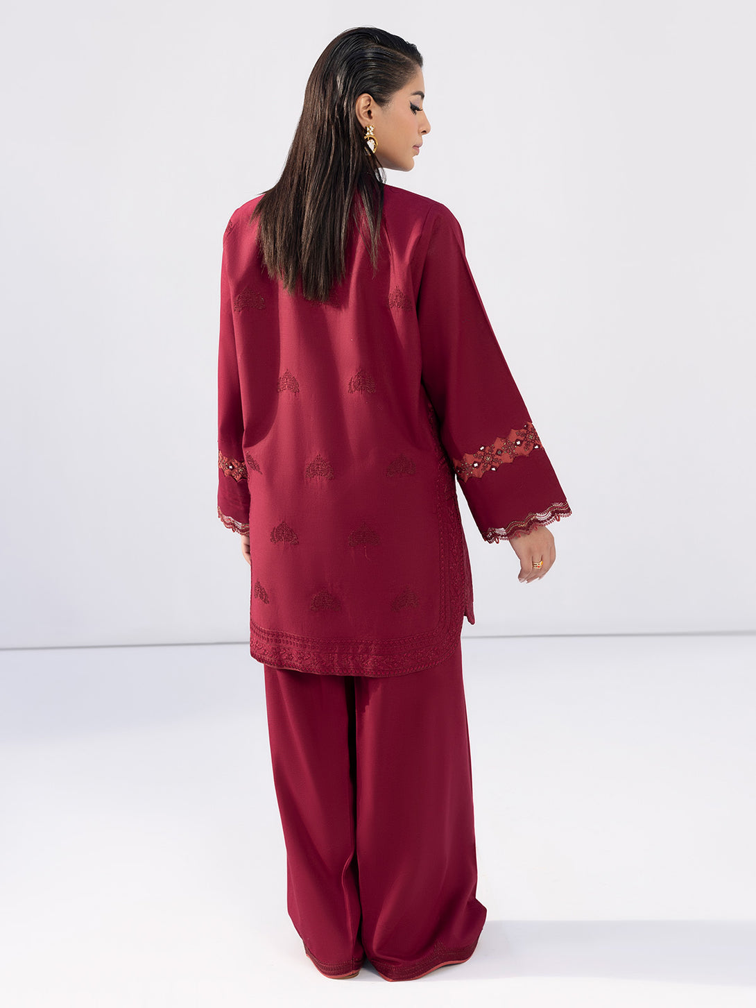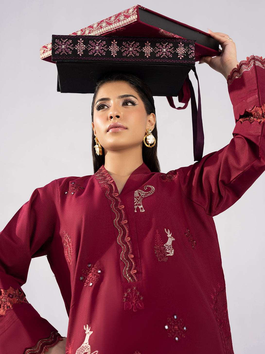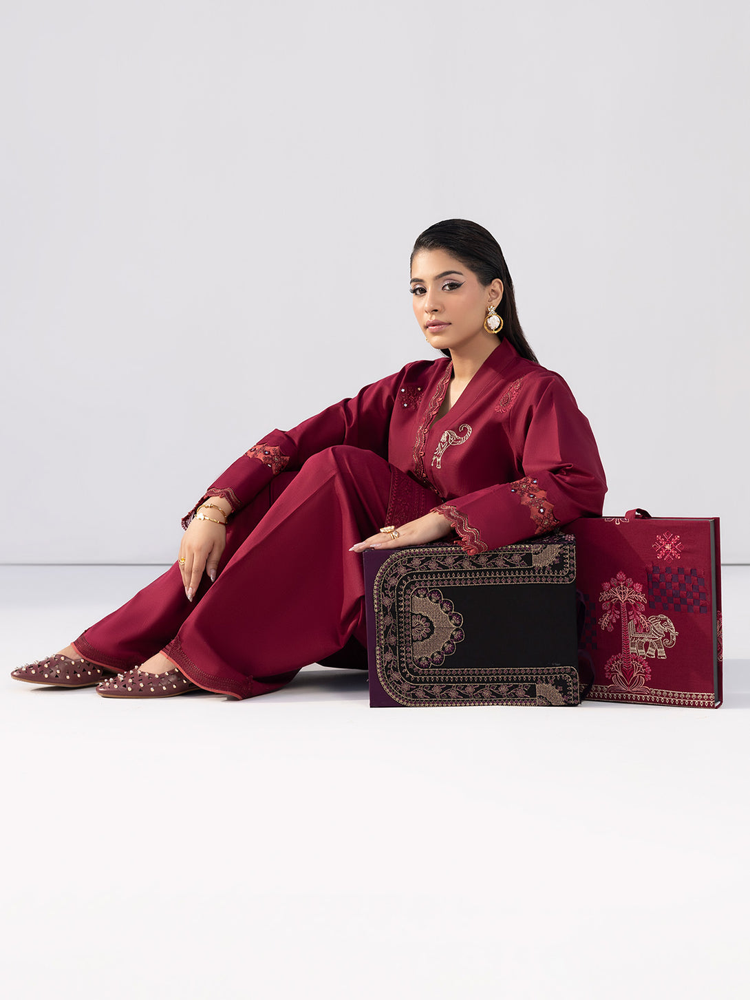 A striking red karandi ensemble with exquisite embroidery and shesha work, paired with a graceful farshi shalwar. Pure elegance, pure confidence.