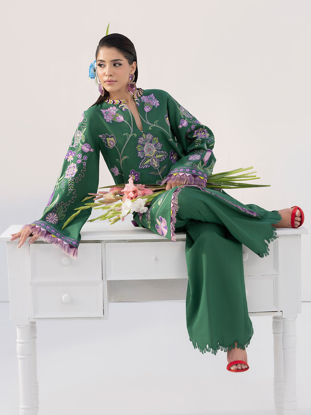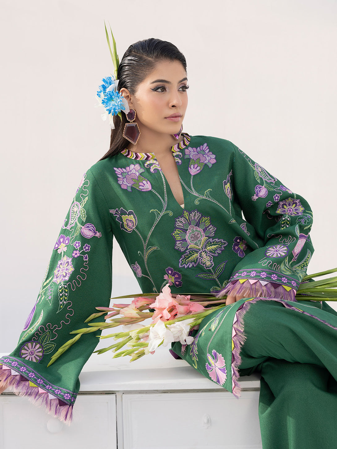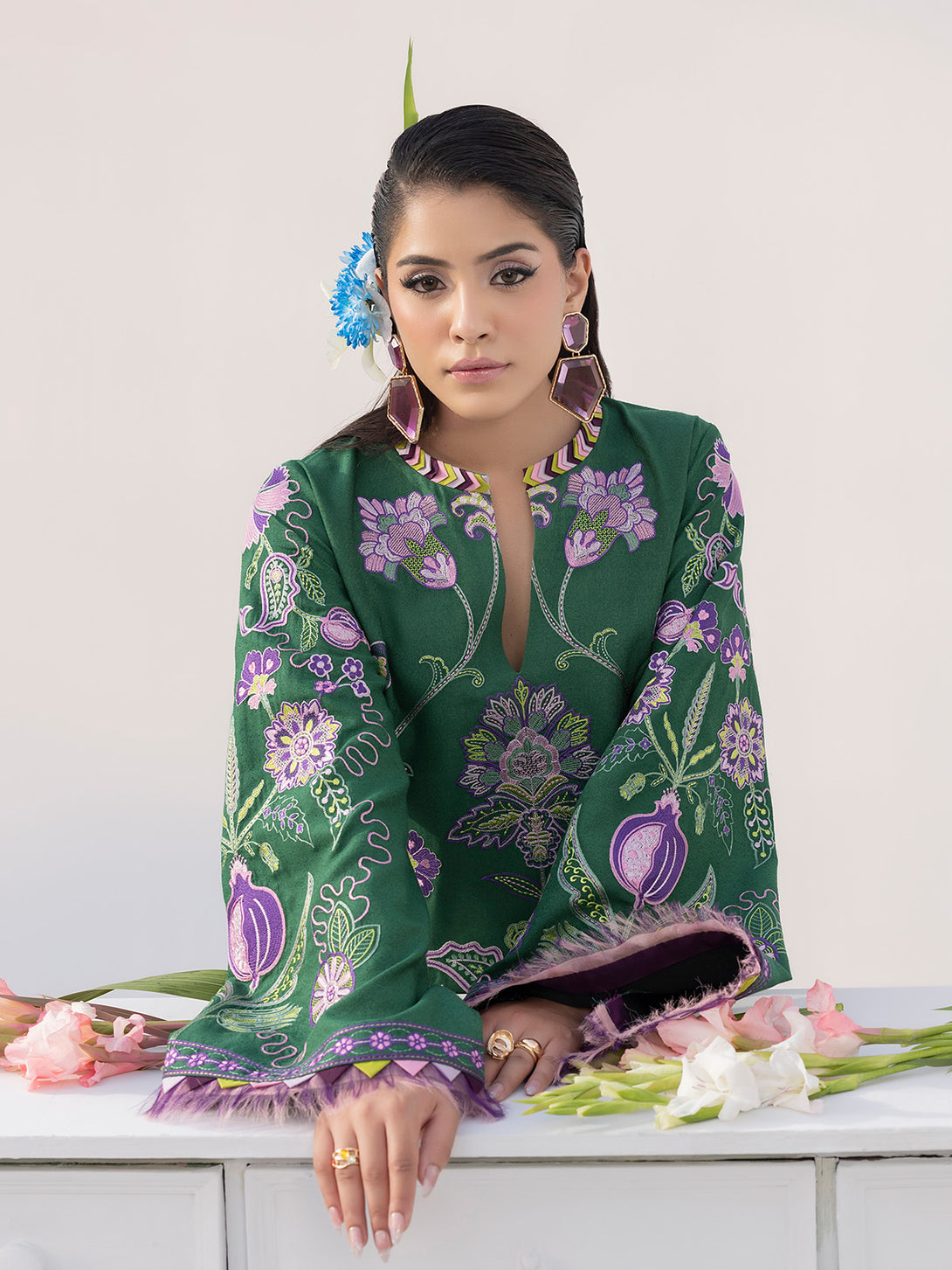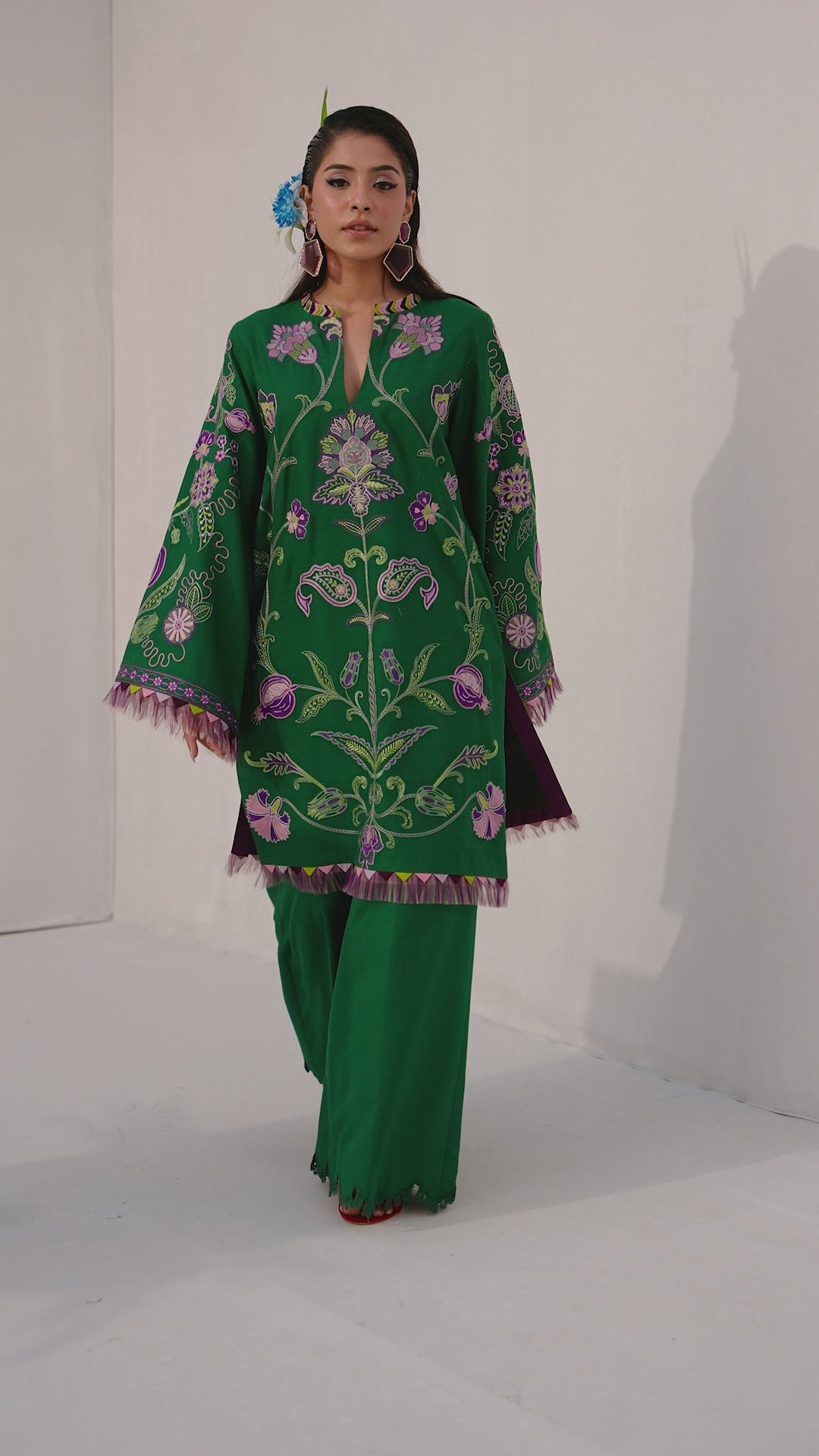 A stunning green karandi ensemble adorned with intricate multi-head embroidery, paired with straight, flowy self-embroidered trousers. A perfect harmony of elegance, warmth, and artistry for the season.