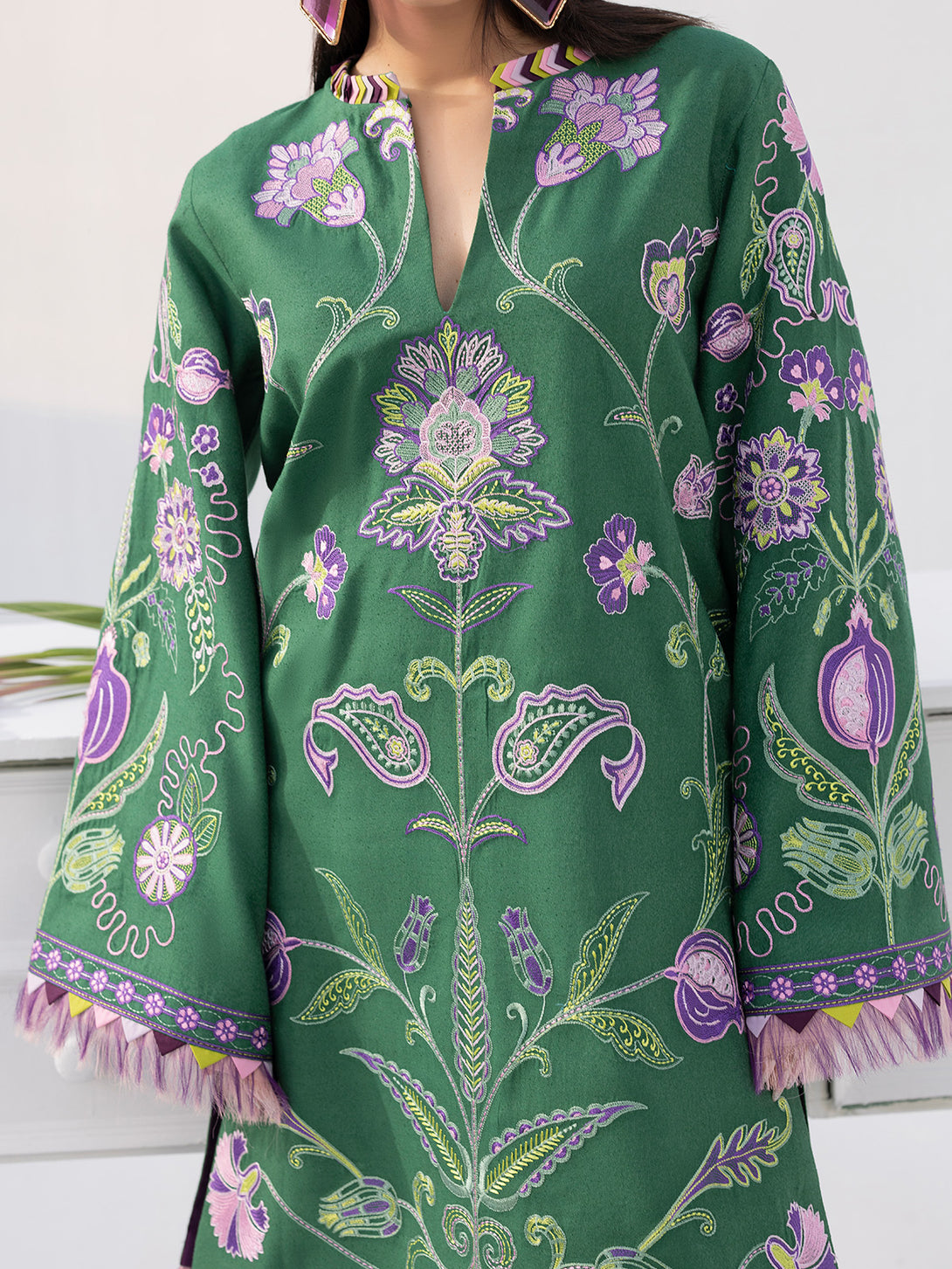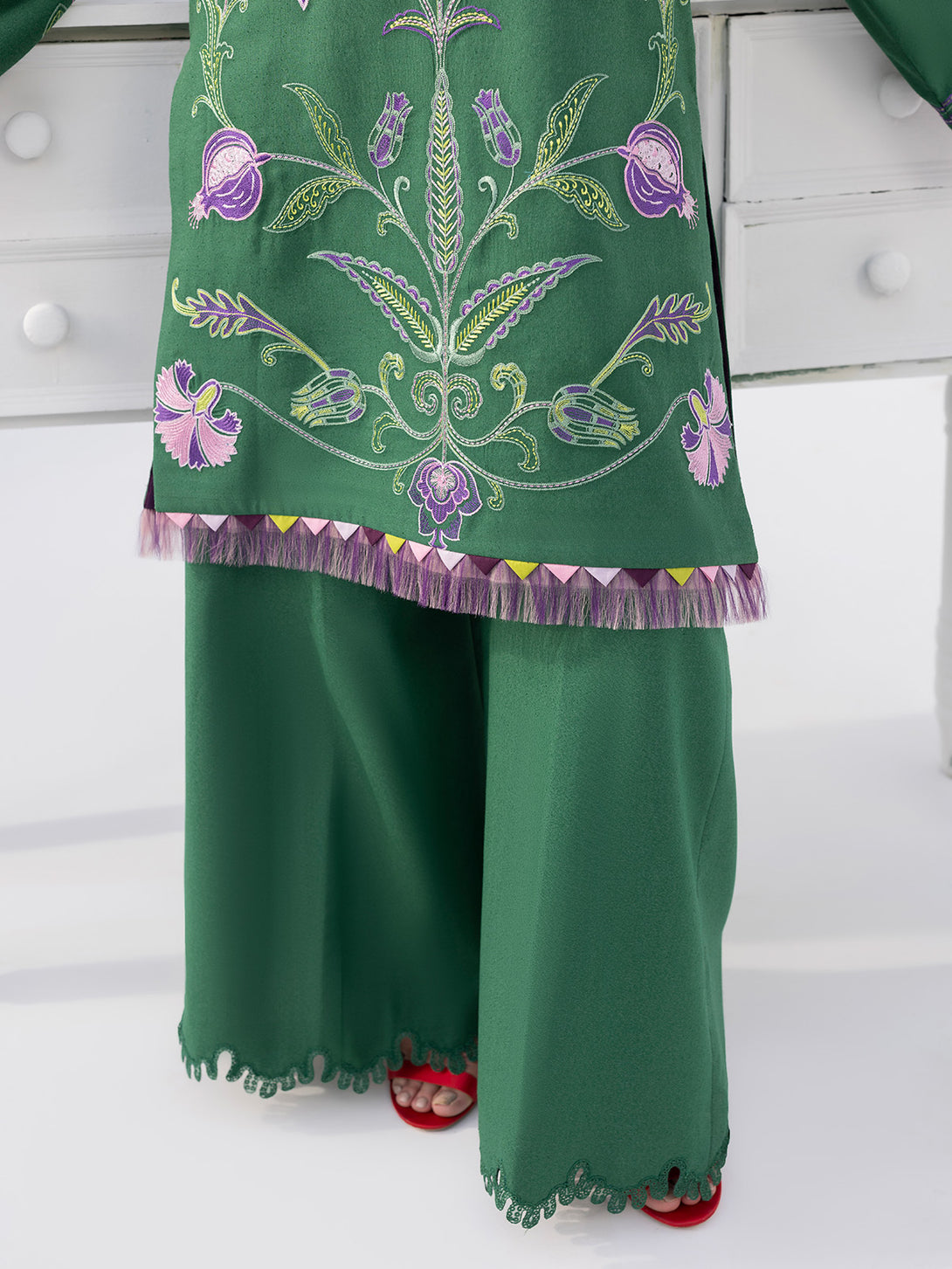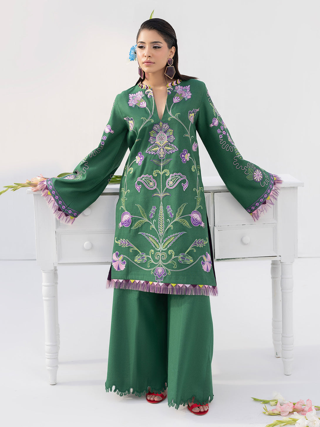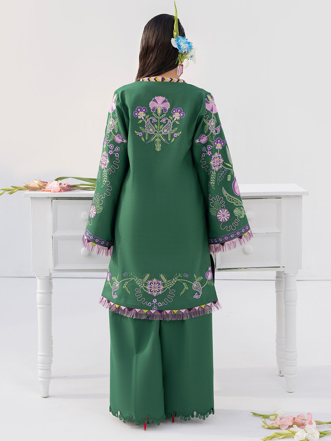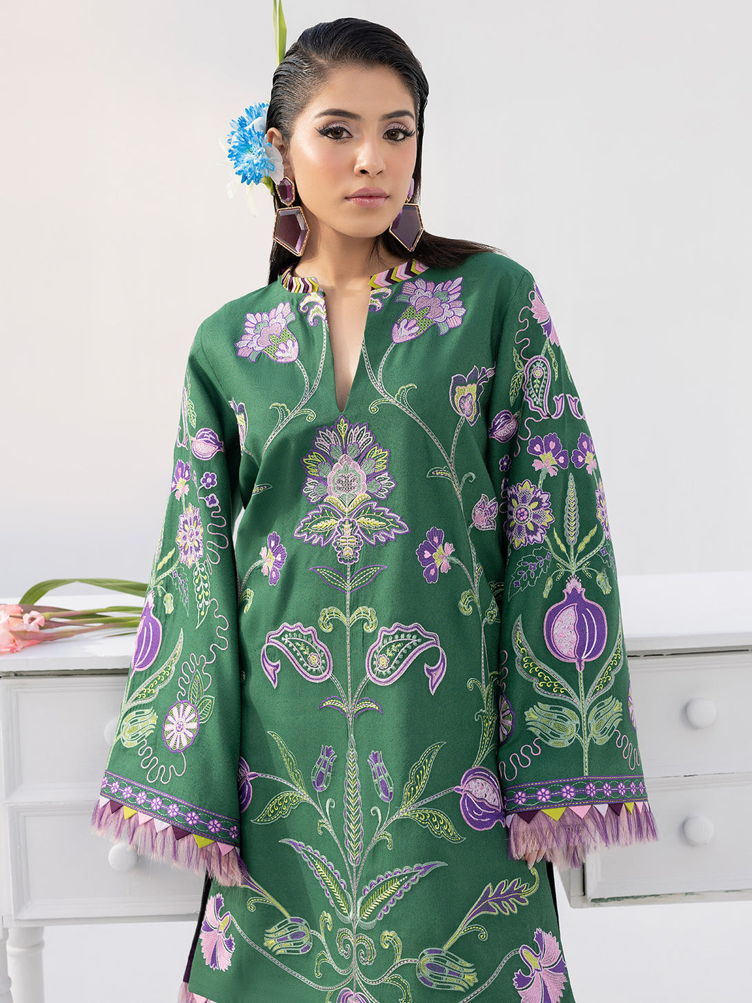 A stunning green karandi ensemble adorned with intricate multi-head embroidery, paired with straight, flowy self-embroidered trousers. A perfect harmony of elegance, warmth, and artistry for the season.