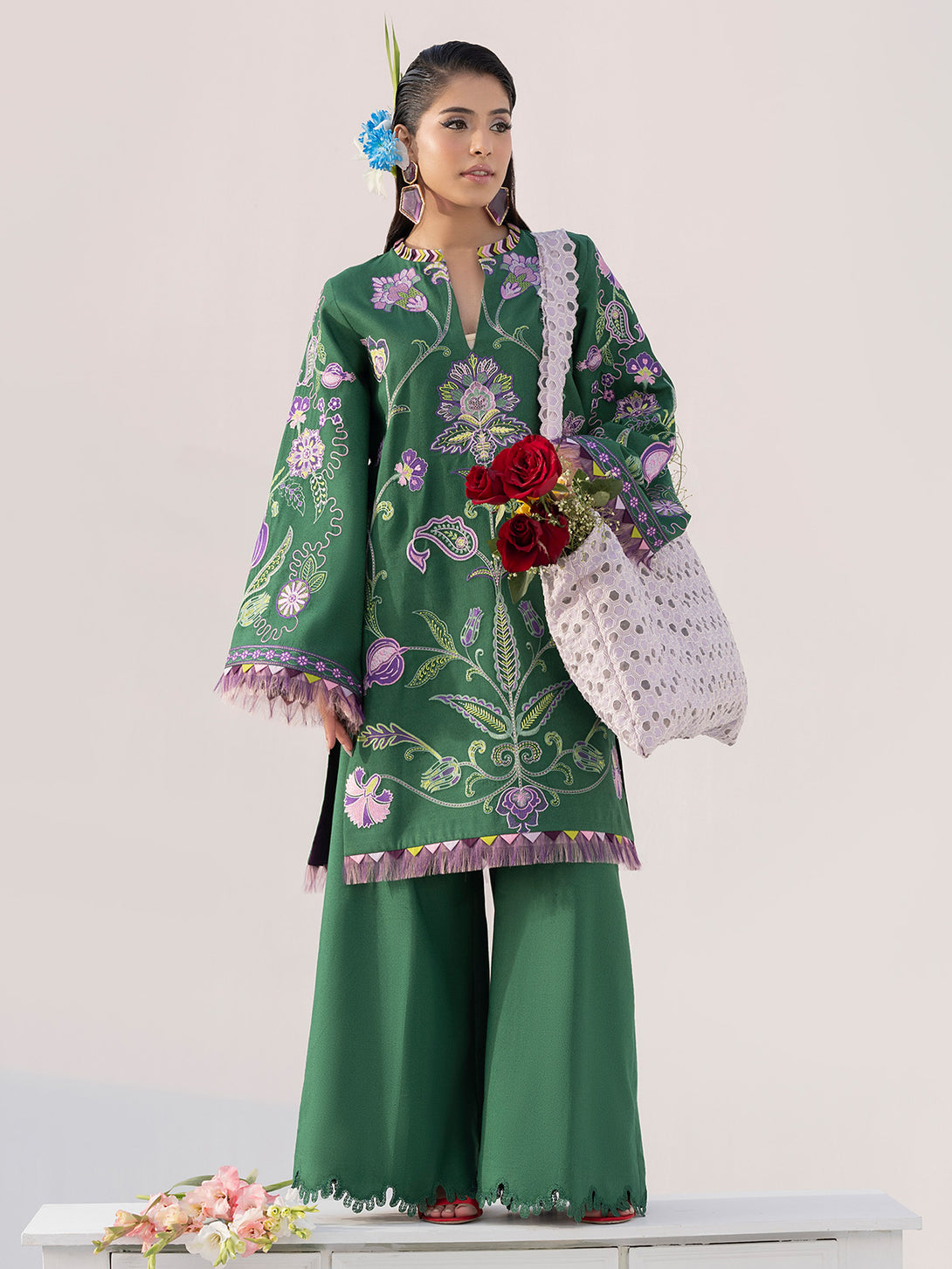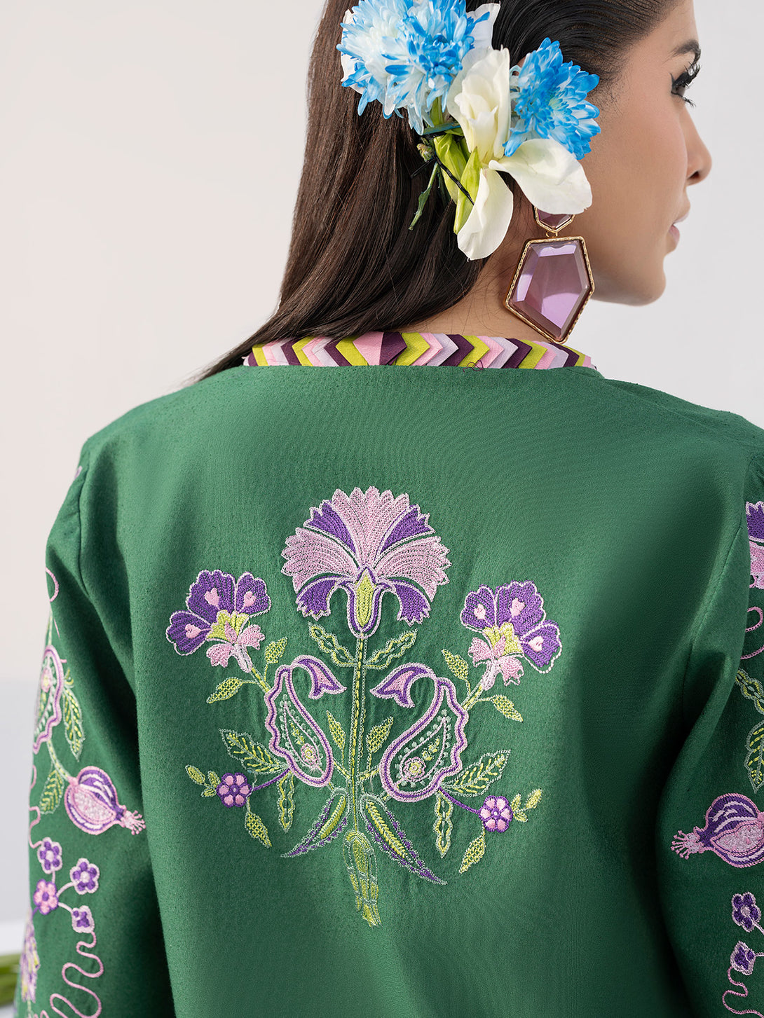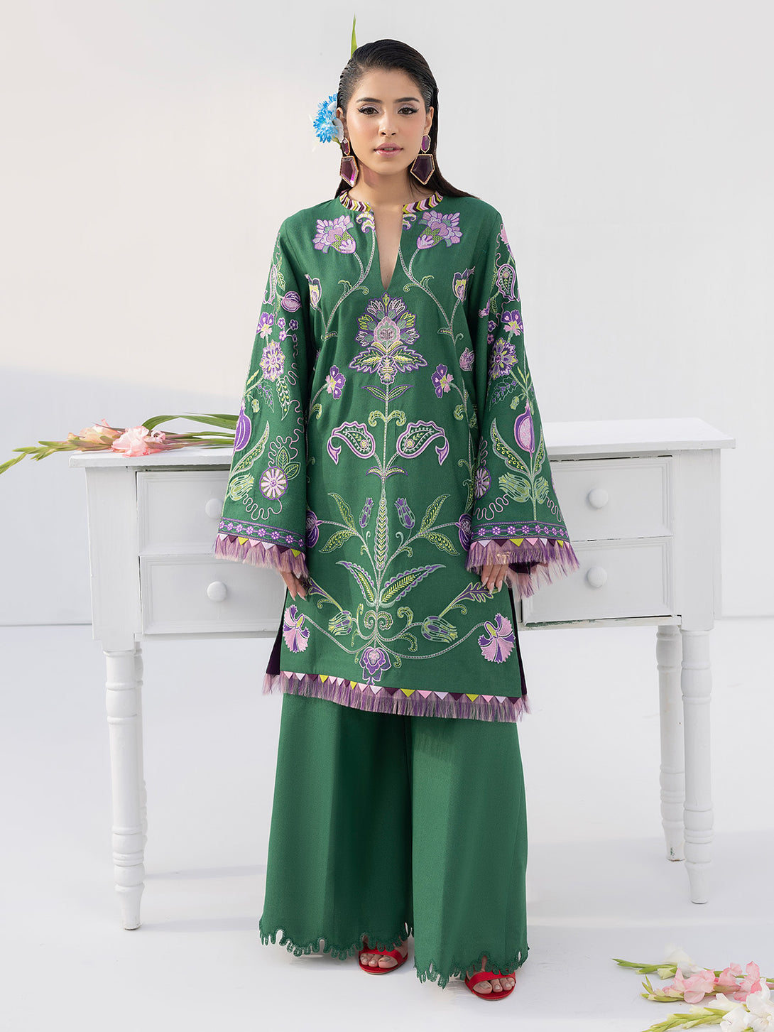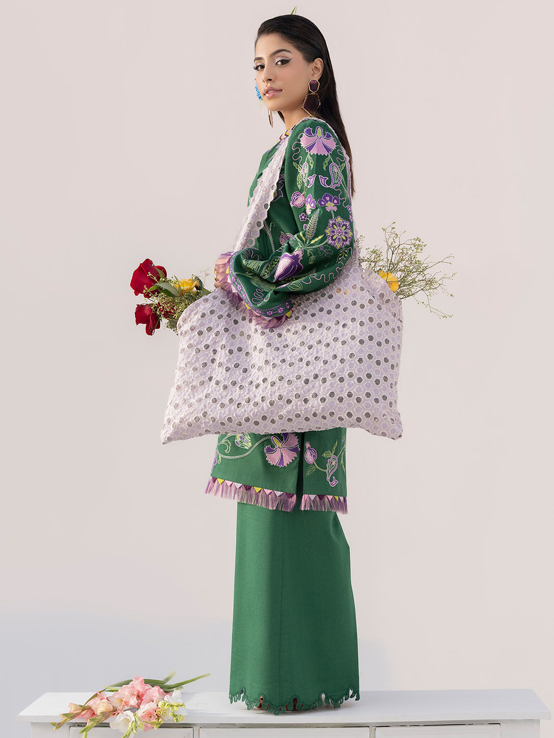 A stunning green karandi ensemble adorned with intricate multi-head embroidery, paired with straight, flowy self-embroidered trousers. A perfect harmony of elegance, warmth, and artistry for the season.